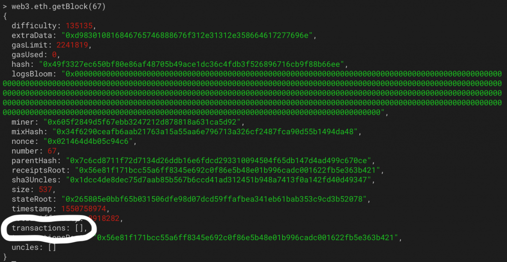Le reçu n’existe plus car la transaction est tout simplement inexistante. Aussi, allons voir les transactions de ce fameux bloc 67 :