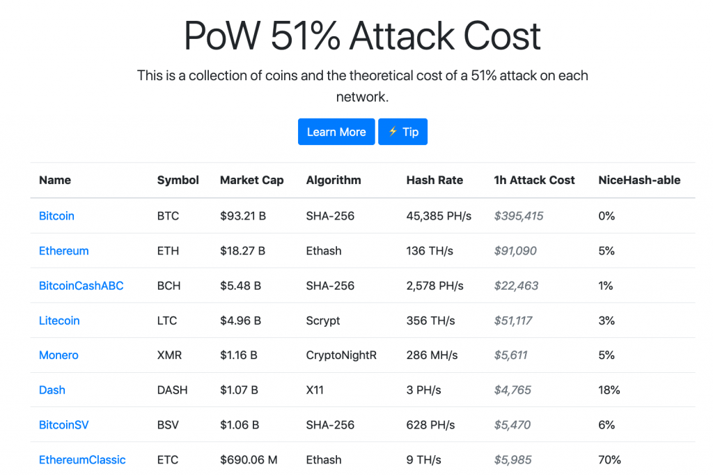 La popularité de cette attaque et l’appât du gain, dans le cadre de la double dépense, ont d’ailleurs poussé la communauté à mettre en place des sites permettant d’estimer combien coûterait une attaque d’une heure sur différentes blockchain, en supposant que l’on loue les machines de minage.