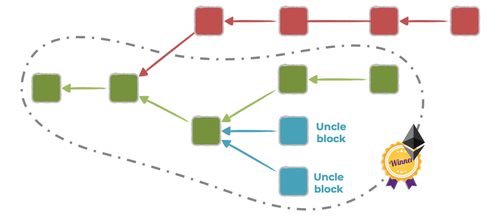 Pour Bitcoin, cela signifie seulement qu’elle est plus longue, alors que pour Ethereum elle doit également contenir plus d’oncles (plus d’informations ici), comme on peut le voir graphiquement ci-dessous :