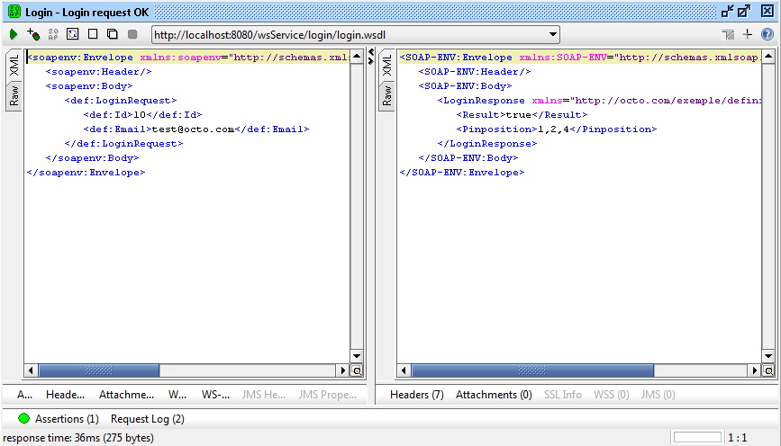 Pour notre exemple, il y a 2 end-points et 2 requêtes : login et (validate) pin. Démarrons avec la première requête : elle contient un identifiant et un e-mail. SoapUI charge la définition de la requête à partir du WSDL publié. On peut entrer nos valeurs pour voir la réponse du serveur.