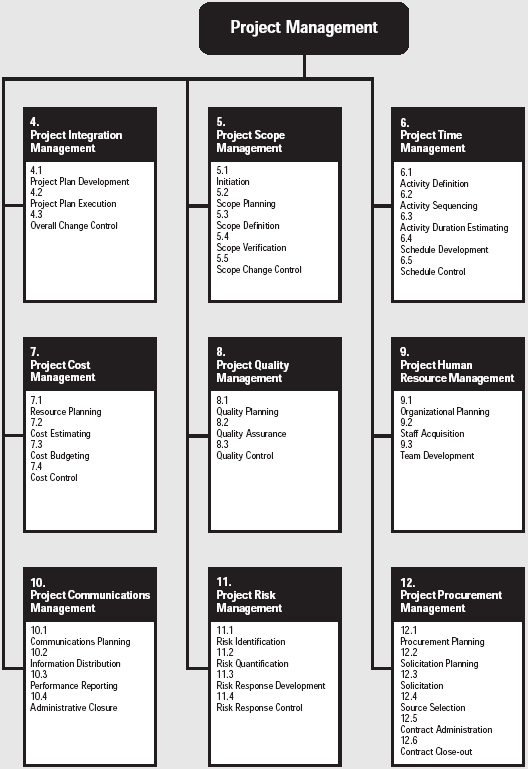 Comme le montre la figure, ces groupes de processus, qui se répètent dans chacune des phases du projet, s'avèrent critiques pour s'assurer qu'aucune étape n'est involontairement oubliée. De même, les disciplines que le chef de projet sera amené à maîtriser sont divisées en neuf domaines de Management :