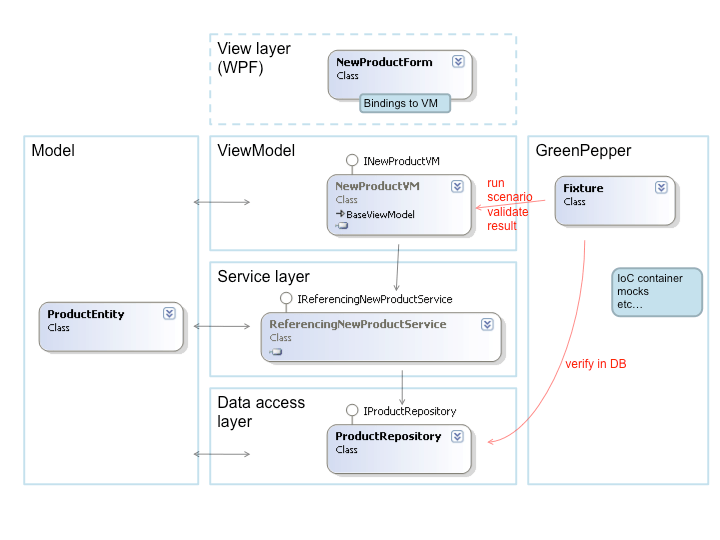 - GreenPepper usually triggers the business scenarios at the ViewModel level, but can also manipulate the underlying layers when necessary, for instance to check that the correct data has been pushed to the DB.