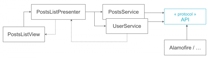 To do this, we use the Dependency Inversion from the SOLID principles and introduce a new API protocol that we will be using in the services. The implementation of this protocol can use NSURLSession directly or any other available networking library.