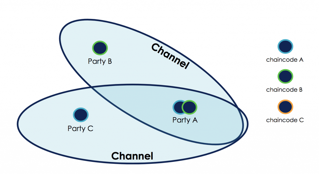 Dans le schéma ci-dessus, les données échangées par les parties A & B dans le chaincode B ne sont pas visibles par la partie C car elle ne fait pas partie du channel 1.