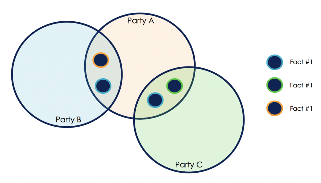 Party A a partagé le Fact #1 avec Party C et Party B, c’est-à-dire qu’ils voient exactement le même état partagé, qui est par ailleurs signé. Dans le même sens, le Fact #2 que partage Party C avec Party A n’est pas visible par Party B.