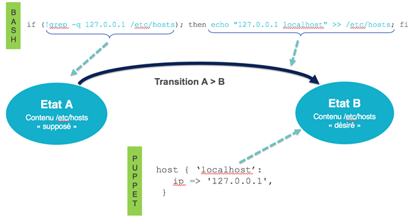 Dans le cas de Puppet, le pattern Ressource nous permet de spécifier directement l’état cible et c’est l’outil qui nous masque la transition.