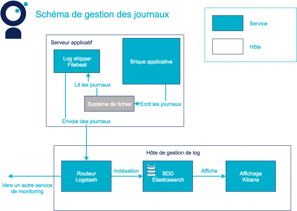 Aucune mécanique de centralisation des journaux n’a été mise en place lors du développement de l’application. Il y a seulement des journaux d’accès générés par les proxys et les briques applicatives de l’application de pilotage. Ces journaux sont stockés sur chacune des machines hébergeant les différents services. Les exploitants vont les remonter à la main par connexion SSH lorsque quelqu’un les demande. Cette demande peut prendre plusieurs jours. Malgré le manque d’outillage pour le monitoring, un schéma d’architecture est disponible dans la documentation du système.