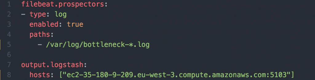 J’ai choisi d’utiliser la stack ELK (Elasticsearch LogStash Kibana) pour la centralisation des journaux. Un agent présent sur chaque brique récupère ces derniers, générés au format JSON (Figure 4) par l’application puis les envoie à Logstash. Dans la configuration suivante, l’agent Filebeat s’abonne aux fichiers de log de type bottleneck-*.log contenu dans /var/log.  Il envoie ensuite l’ensemble des fichiers à Logstash au fur à mesure qu’ils sont écrits par l’application.