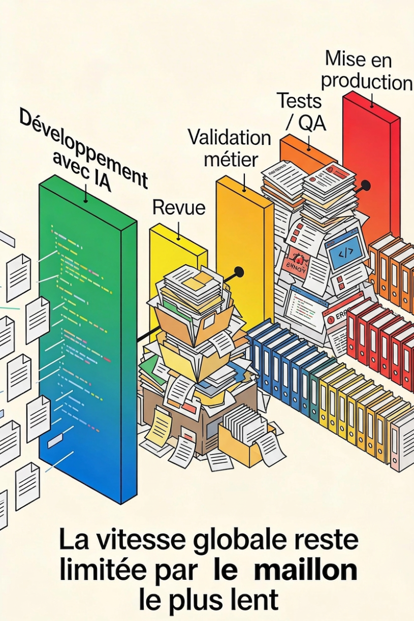 L’accélération de la production de code grâce à l’IA met en évidence un principe fondamental : la vitesse globale reste contrainte par le maillon le plus lent. En augmentant fortement le débit de développement, de nouveaux goulets d’étranglement apparaissent notamment dans les phases de revue, de validation, de test ou de mise en production.