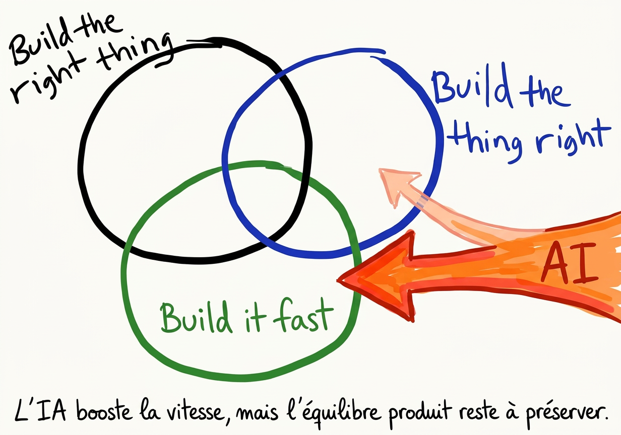 Enfin, la construction d'un produit repose sur un équilibre entre trois impératifs : « Build the right thing » (construire le produit attendu), « Build the thing right » (techniquement bien construit) et « Build the thing fast » (suffisamment rapidement). Boostée par l'IA, l'équipe peut gagner sur le "fast" et le "right". Mais l'aisance de mise en œuvre et l'accélération des cycles peuvent rapidement conduire à des dérives, où l'on privilégie l'exécution au détriment de la pertinence du produit. Sans vigilance, l'équipe (au sens large) risque de construire "vite" un produit qui ne correspond pas aux attentes des utilisateurs.