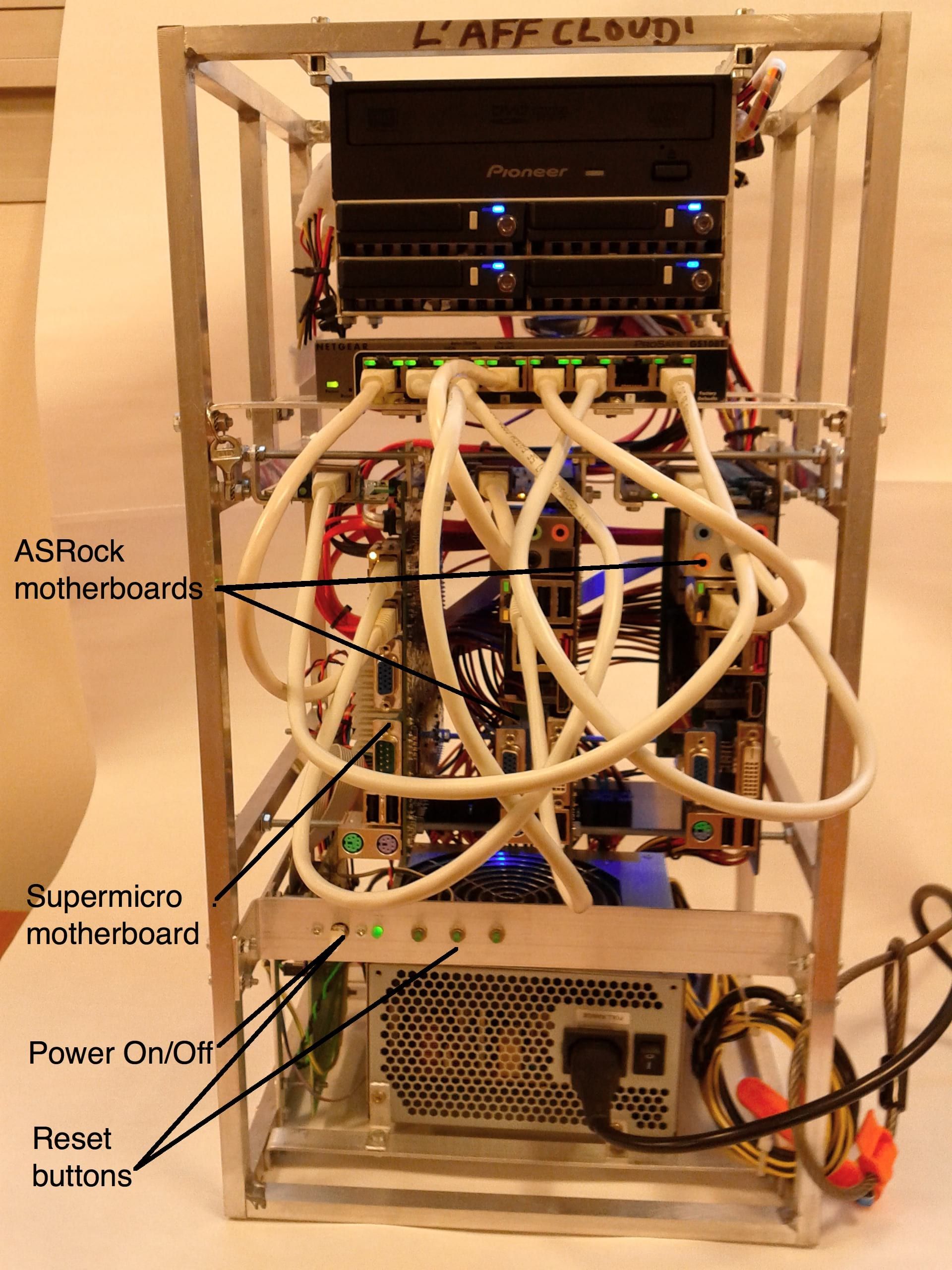 I chose common low cost hardware that one finds on good shops on the Internet. Compute nodes can bear up to 8 GO.