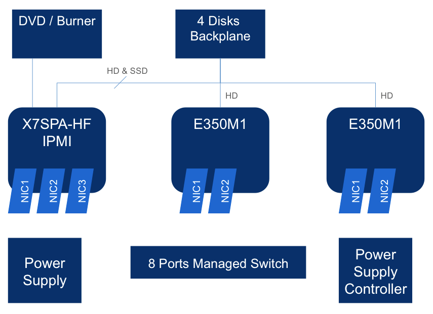 This card provides very good value for the price, is simple to install and manage. But the key issue of commodity hardware is the lack of management functions: no IPMI, no ability to reset through the network, no SMB access… Then, I decided to use two ASROCK E350M1 as “compute” nodes, and to find a board with remote management capabilities as a “controller node”. Looking for such motherboard I chose the Supermicro X7SPA-HF. This board is rather expensive but has some interesting capabilities: IPMI onboard, access to SMB, 2 Ethernet ports, passive cooling…