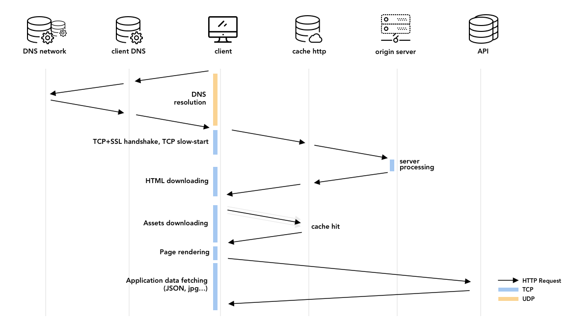 Fortunately, many improvements have been made over the years. DNS resolutions are cached at different places, TLS handshakes results are reused. TCP connections were allowed to be persisted between multiple requests, avoiding the cost of both connection setup and slow-start on each request. TCP’s initial congestion windows was lifted up twice, from 1 to 4 and more recently, to 10. Browsers started to open up parallel connections (6) as well as some really advanced strategies to accelerate page load times. Some proposals tried to break free from the connection setup, although none of them are widely implemented. Some CDN even acquired patented algorithms to tune some of TCP aspects such as congestion avoidance, always for the same reason: speed up delivery.