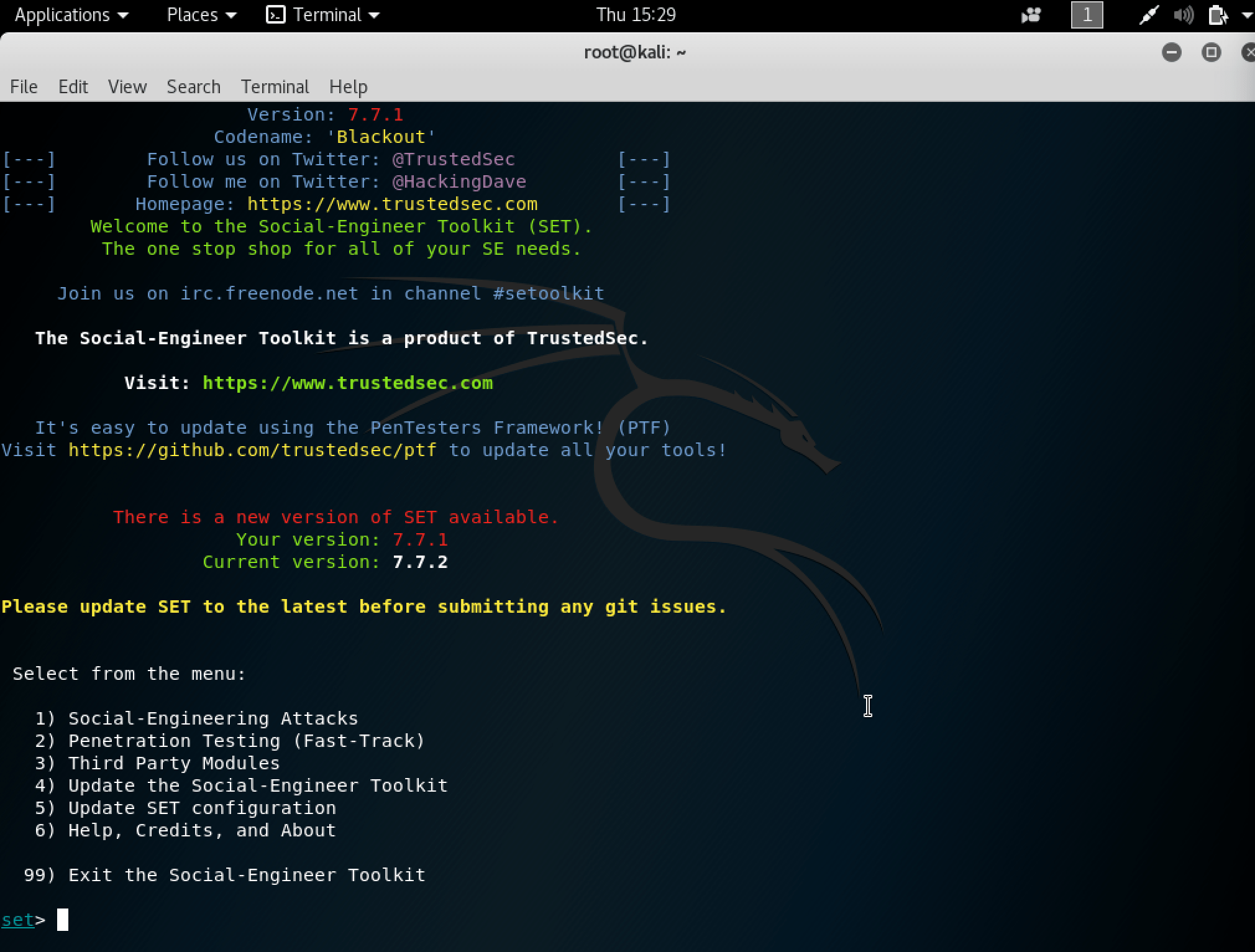 Pour commencer nous allons utiliser le logiciel seToolKit, installé de base sur Kali-Linux, il est open source et permet diverses attaques basées sur l’hameçonnage, notamment via le framework Metasploit.