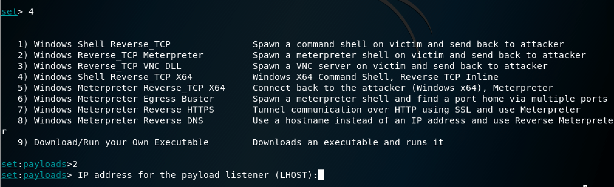 Une fois lancé, seToolkit nous propose un menu pour choisir la façon dont nous allons configurer notre “payload” (charge utile en Français), qui sera caché dans le trojan :