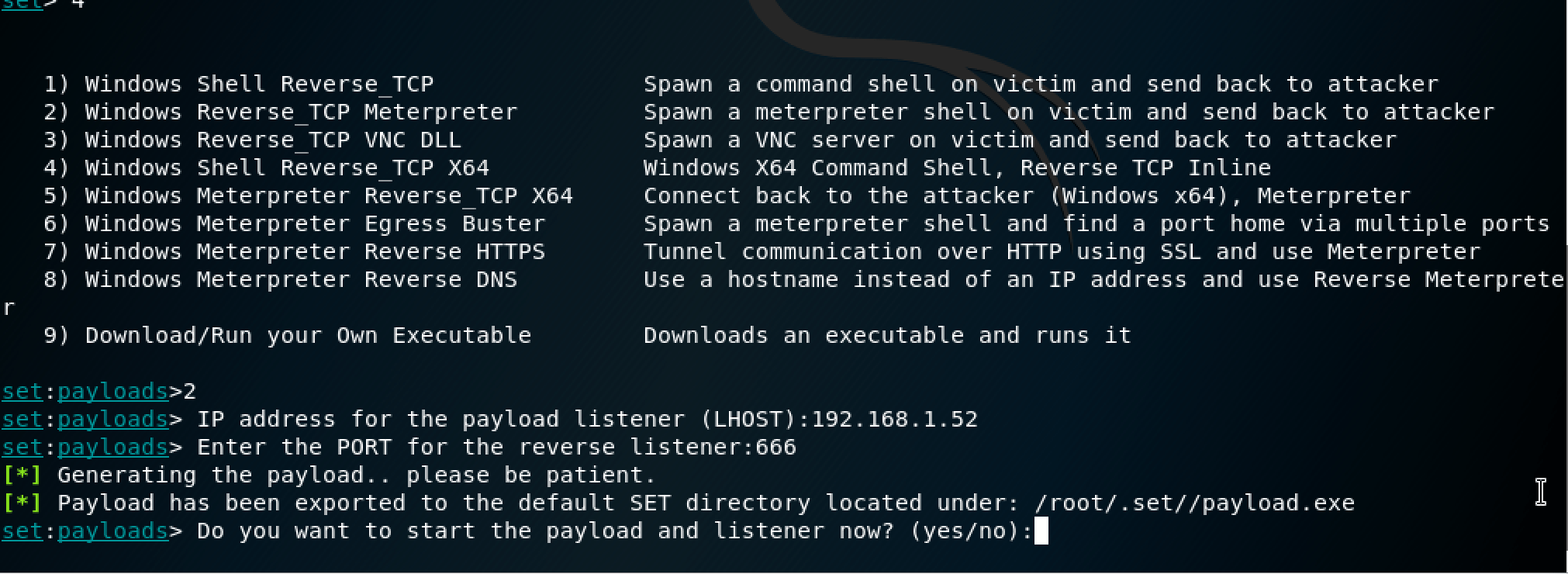 A l’étape suivante, nous souhaitons configurer un trojan capable d'ouvrir une console shell sur la machine cible, puis d'en donner les droits à distance à la machine d'attaque. Choisissons donc l’option Windows Reverse_TCP Meterpreter, lorsque l’on nous demande l’adresse IP pour le “payload listener” entrez l’adresse IP de l’attaquant. Pour le port, saisissez le port libre de votre choix (nous prendrons ici le 666 pour des raisons évidentes...).
