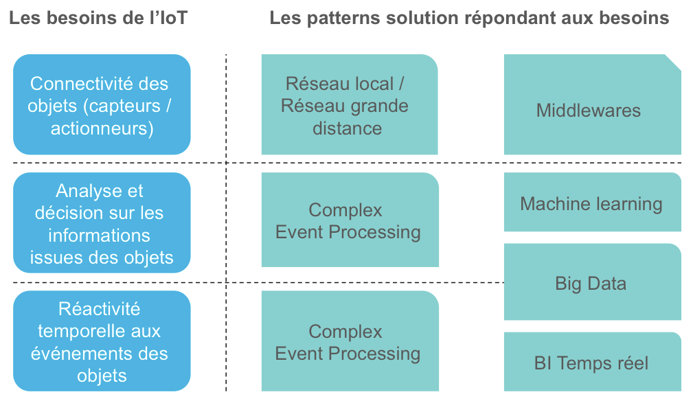 Cette première partie de l’article a pour objectif de présenter les besoins de l’IoT, les patterns "solution" utiles et de les illustrer sur des cas concrets. Nous allons donc nous focaliser sur les éléments présentés ci-dessous :