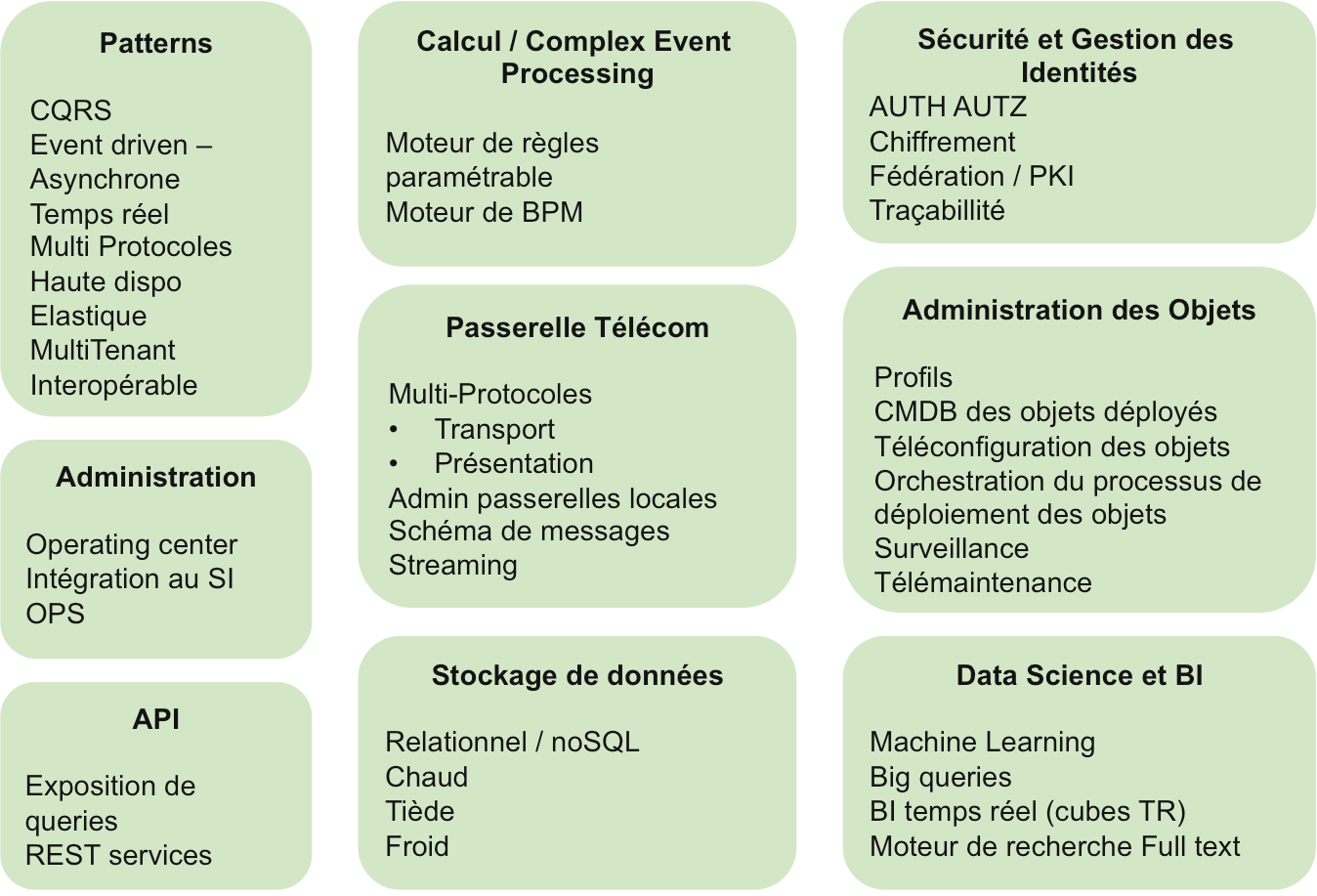 - Event driven – Temps réel - Asynchrone : La plate-forme reçoit des événements des objets et fait évoluer sont état. Elle offre des facilités de traitements événementiels temps réel (calcul de durées, cumuls temps réel…). Les traitements sont asynchrones. Les protocoles de l’IoT supportent en général bien ce pattern.
