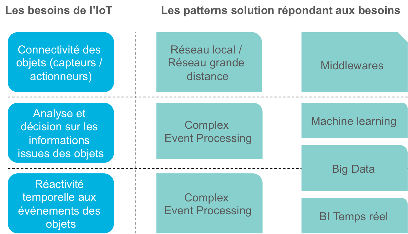 Dans la première partie de cet article, nous avons vu que l’IoT a des besoins tels qu’exprimés sur la figure ci-dessous. En face de chaque besoin apparaissent les patterns/solutions/technologies qui les adressent parfaitement :
