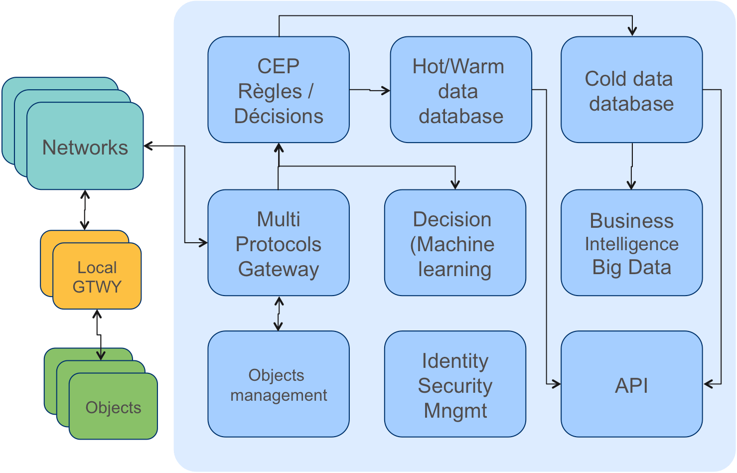 Les solutions « reines » face à ces besoins sont constituées de réseaux, de middlewares de communication bidirectionnelle, et de 4 grandes technologies qui se démarquent dans les plates-formes IoT : Le Complex Event Processing, le Big data, le machine learning et la BI temps réel. Nous allons voir comment elles s’agencent dans une plate-forme IoT.