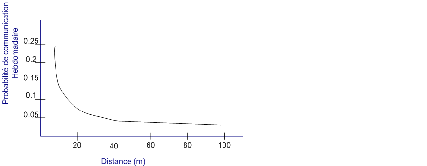 - au-delà de 9 mètres, il y a moins d’une chance sur 10 pour que 2 acteurs communiquent une fois dans la semaine ;