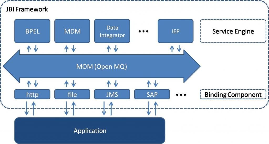 Cette solution respecte les standards JBI. Elle se compose de modules de transformation (des Service Engines) et des adaptateurs (des Binding Components).