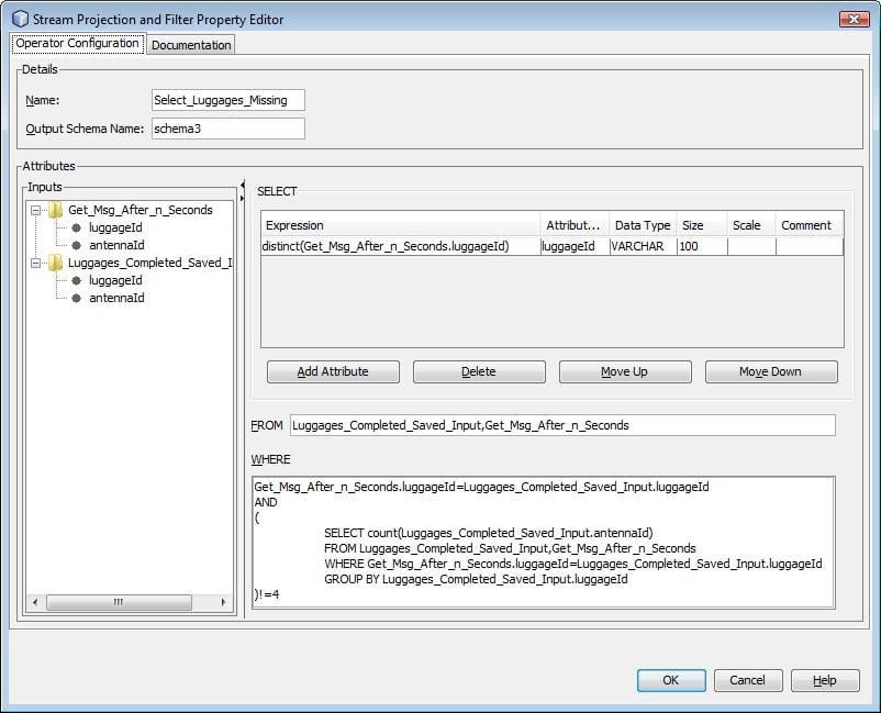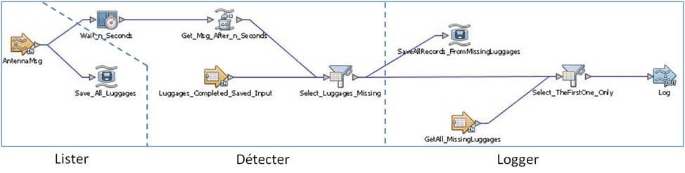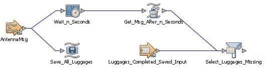 Pour détecter un bagage manquant, il faut attendre les n secondes nécessaire à son temps de transport après qu’il a été signalé par la première antenne, puis vérifier que les 4 messages envoyés par chacune des antennes tout au long du parcours ont bien été transmis. Pour cela nous allons utiliser le composant nommé Wait_n_Seconds sur le schéma, qui est du type Time Based Window.