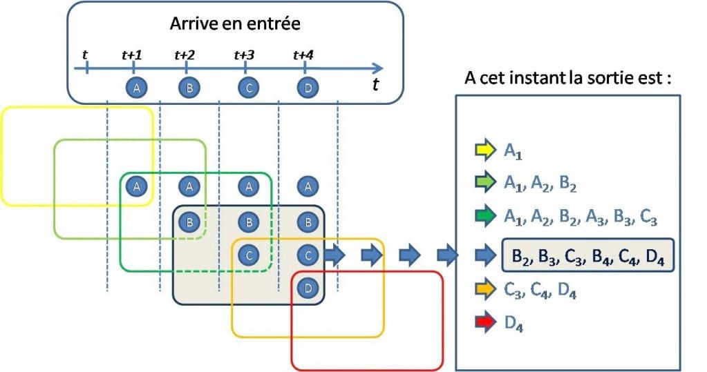 - Lorsque C arrive à t+3, le même principe est appliqué, A1, A2 et B2 sont toujours dans la fenêtre temporelle donc présentés en sortie, et C s’y ajoute. Nous aurons donc A1, A2, B2 et A3, B3, C3.
