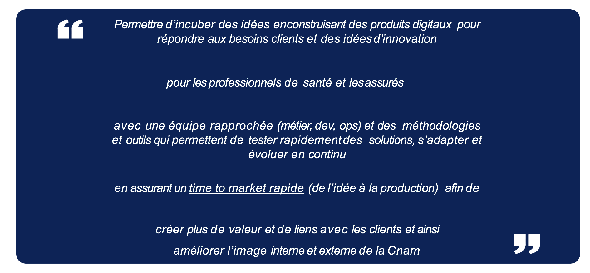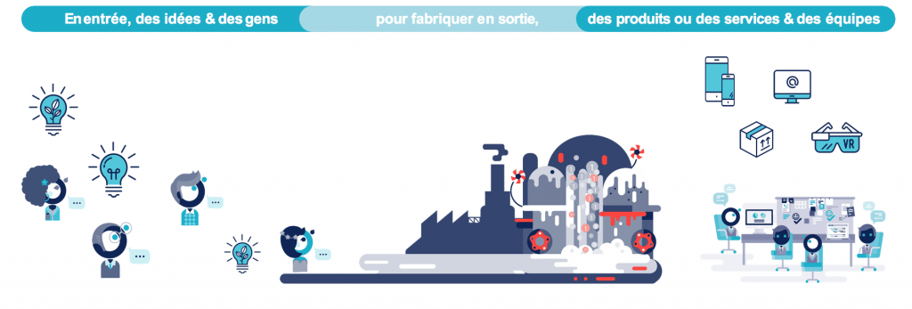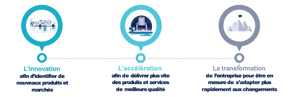 - Le besoin d’accélérer (ie délivrer plus vite des produits et services de meilleure qualité) à travers l’incubation, la réalisation de MVP ou Proof of concept, afin de tester un marché potentiel et une nouvelle manière de faire.
