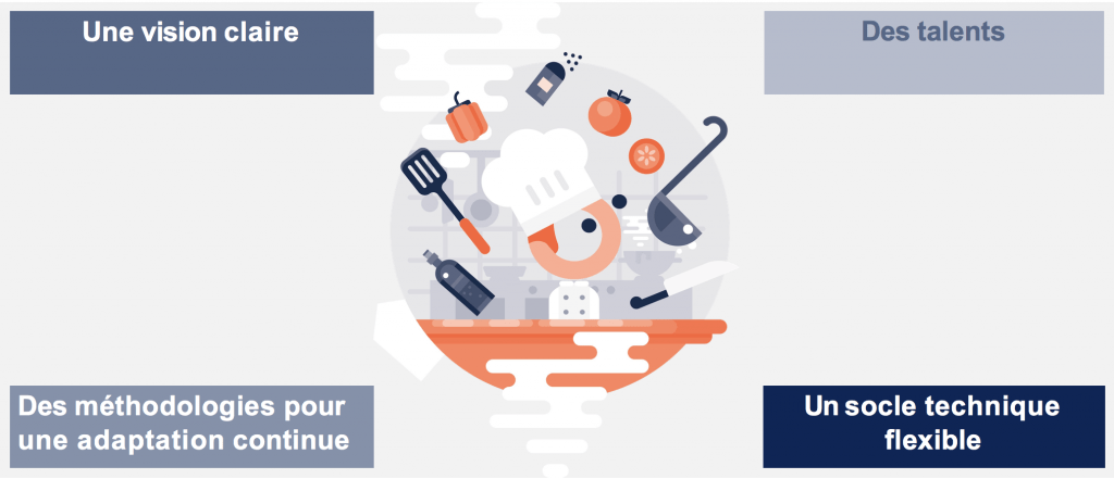 - Des méthodologies : s’adapter continuellement, faire évoluer en permanence un produit orienté utilisateur, priorisé par la valeur. Adopter une culture de Test & Learn et Fail Fast en assouplissant un certain nombre de contraintes habituelles.