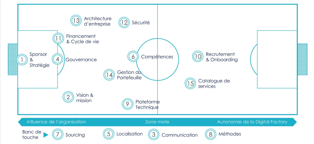 Imaginez la zone de défense comme celle qui a le plus d’adhérence avec le reste de l’organisation, celle qui est le plus soumise à ses contraintes. Il est important d’avoir une interface forte pour protéger votre Digital Factory, c’est le rôle du sponsor ou du manager de la factory, positionné en gardien de but.