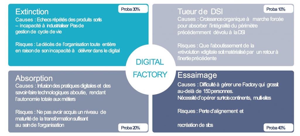 Pour toutes ces raisons, nous considérons que les caractéristiques d’une Digital Factory la situe autour de la phase d’accélération comme un relais pérenne entre l’exploration et le passage à l’échelle au sein de l’entreprise. Le critère de succès de ce passage à l’échelle est la généralisation de ses caractéristiques culturelles, humaines et techniques.