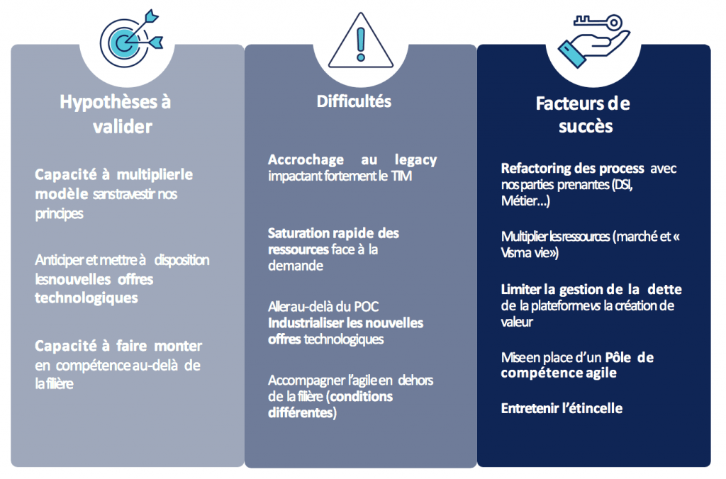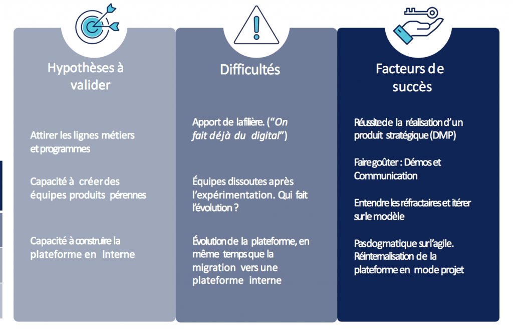 - Une vision claire : délimiter le périmètre de la Digital Factory et ses missions, incarner les valeurs du digital (droit à l’erreur, partage, collaboration, démarche d’apprentissage permanent…), être ouvert sur un écosystème élargi (pouvoir / savoir travailler avec les “meilleurs”), bénéficier d’un sponsorship au plus haut niveau exécutif.