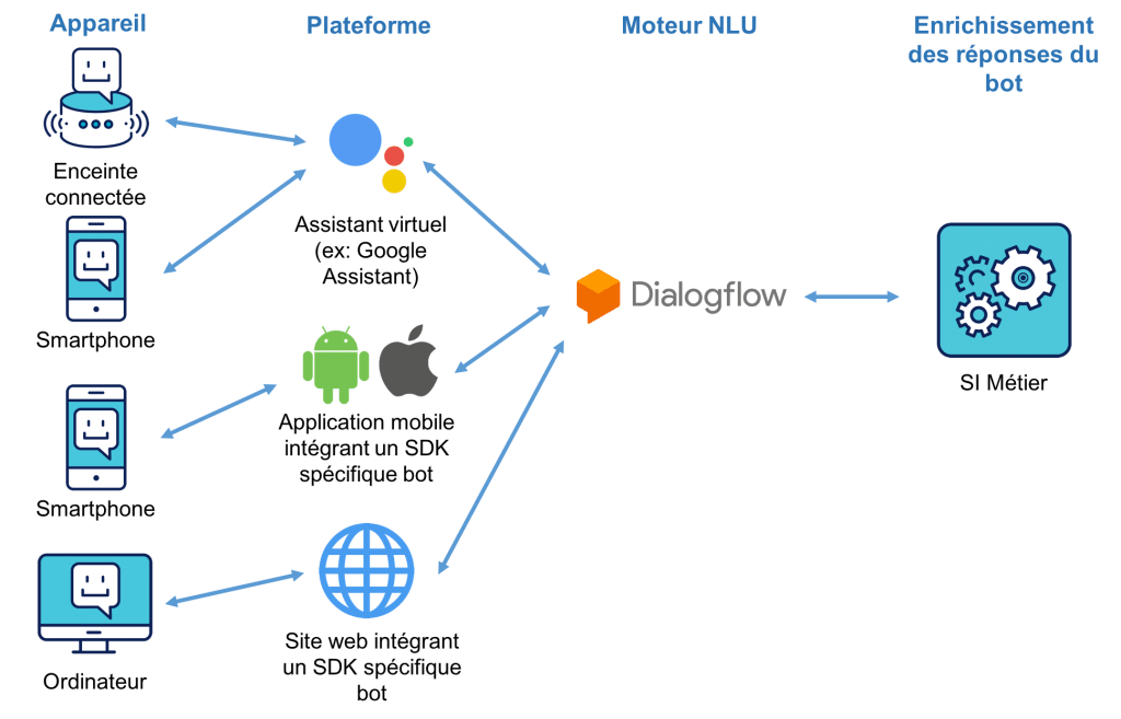 - Déploiement sur plusieurs type de devices : Un assistant virtuel peut être présent à la fois sur une enceinte connectée au sein du foyer, sur un smartphone ou même dans une voiture. Une fois notre bot déployé via l’assistant, il sera accessible depuis l’ensemble des devices supportant l’assistant.