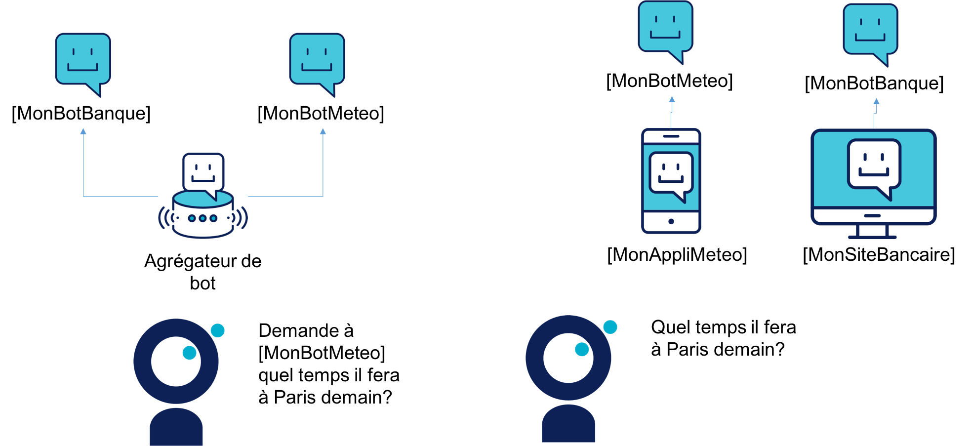 L’agrégateur de bot prend souvent la forme d’un assistant virtuel comme Siri, Alexa, Cortana ou Google Assistant. Ces assistants possèdent un ensemble de fonctions natives (lancer un timer, noter un rendez-vous, faire une division…) mais peuvent s’appuyer sur des applications tierces (comme notre bot) pour étendre leurs capacités.