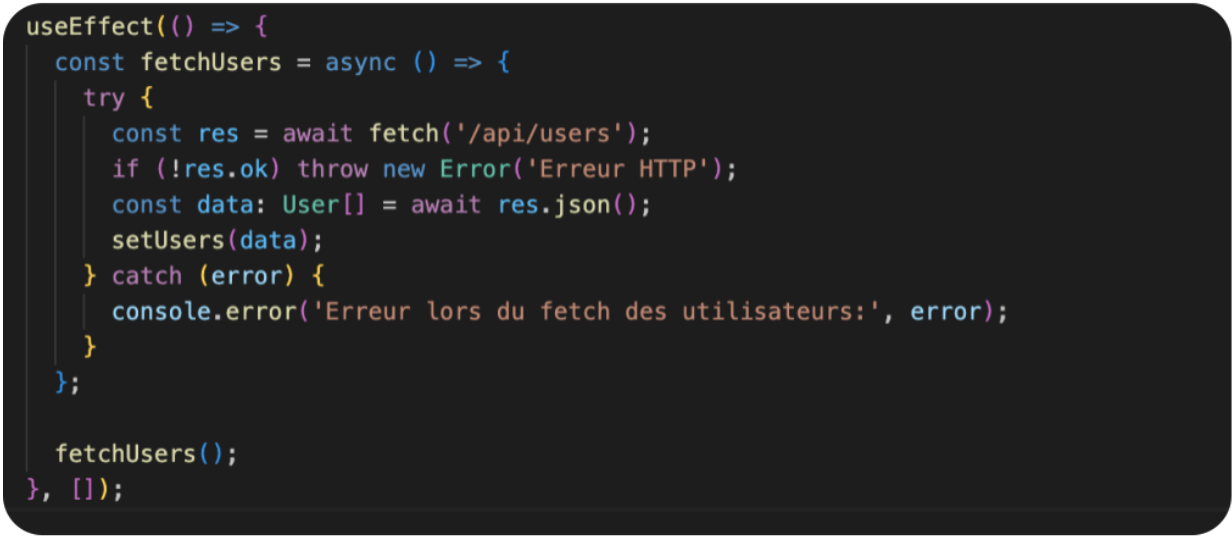 React, en natif, ne fait pas de rendu serveur. Il faut donc attendre que le JavaScript soit chargé pour exécuter le fetch et afficher les données. Voici un exemple classique avec un hook useEffect :