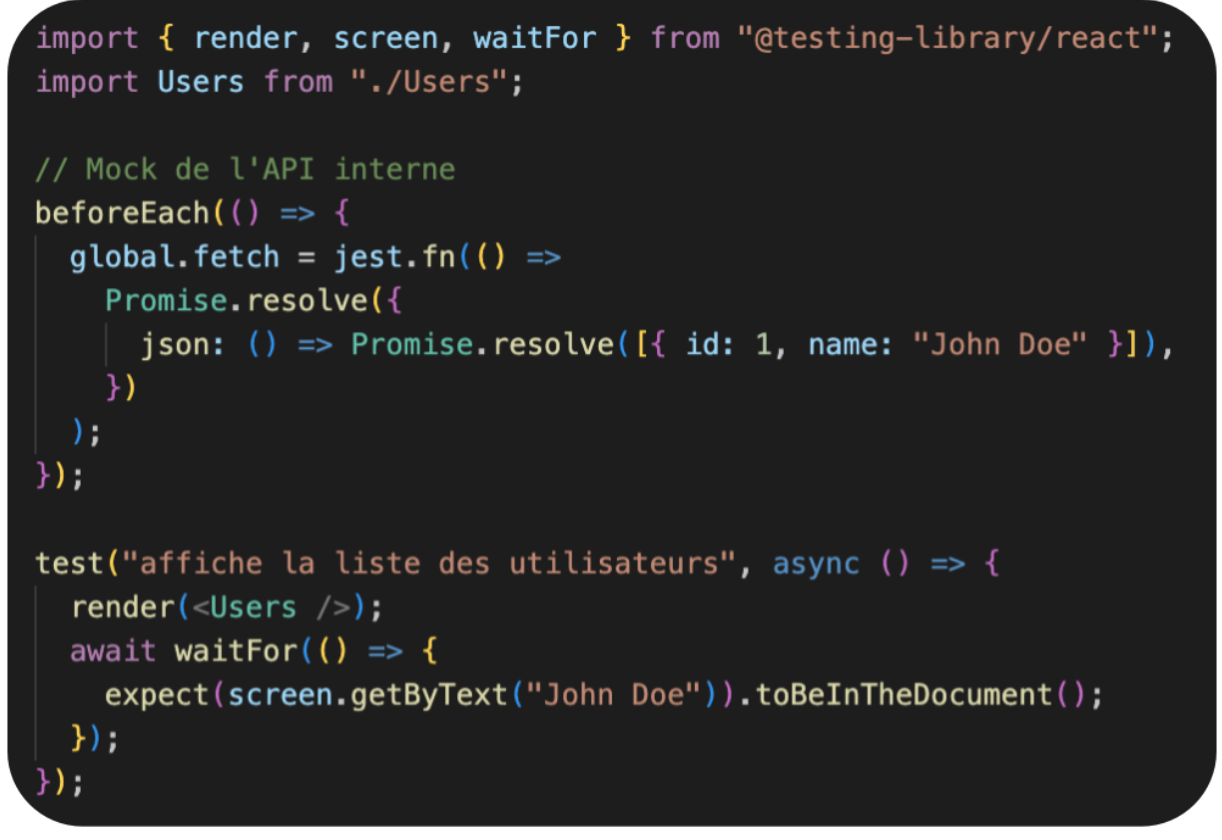 Next.js te permet de tester tes composants comme en React pur, mais dès qu’il y a une API route (/pages/api/), il faut mocker le fetch() ou tester cette API séparément (en test d’intégration ou avec un handler isolé).