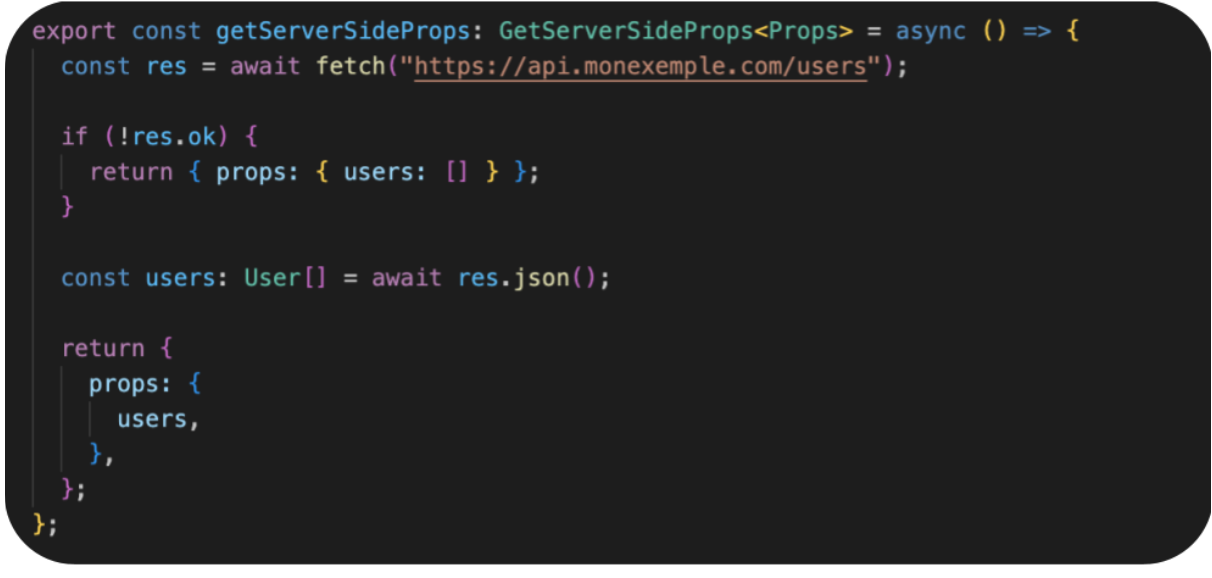 Avec Next.js, on récupère les données avant que la page ne soit affichée à l’utilisateur. Le rendu est donc prêt à l’affichage, optimisé pour le SEO et la rapidité de chargement perçue. Voici un exemple avec getServerSideProps :