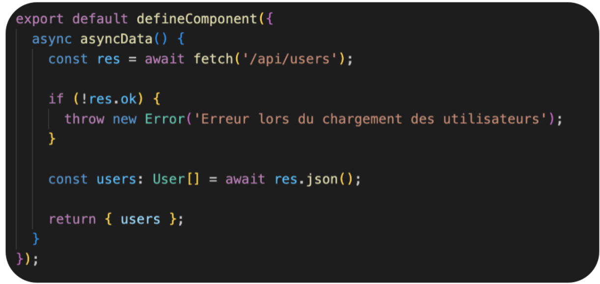 Angular ne propose pas de SSR natif hors de sa solution Angular Universal. Par défaut, les appels API sont donc faits côté client après le chargement de l’application. En revanche, il fournit un service HTTP typé, injectable et réutilisable, qui rend le code très structuré :