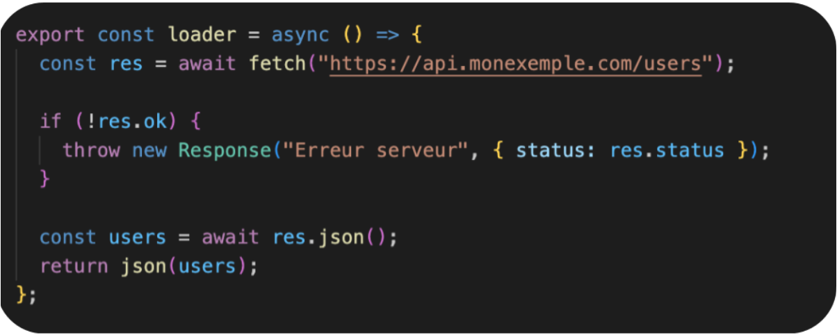 Avec SvelteKit, on peut récupérer les données dans une fonction load() directement liée à la page. Cette fonction peut s’exécuter côté serveur avant le rendu, ou côté client en navigation interne. L’approche est fluide, et très proche de la structure du fichier. Voici un exemple dans un fichier +page.js :