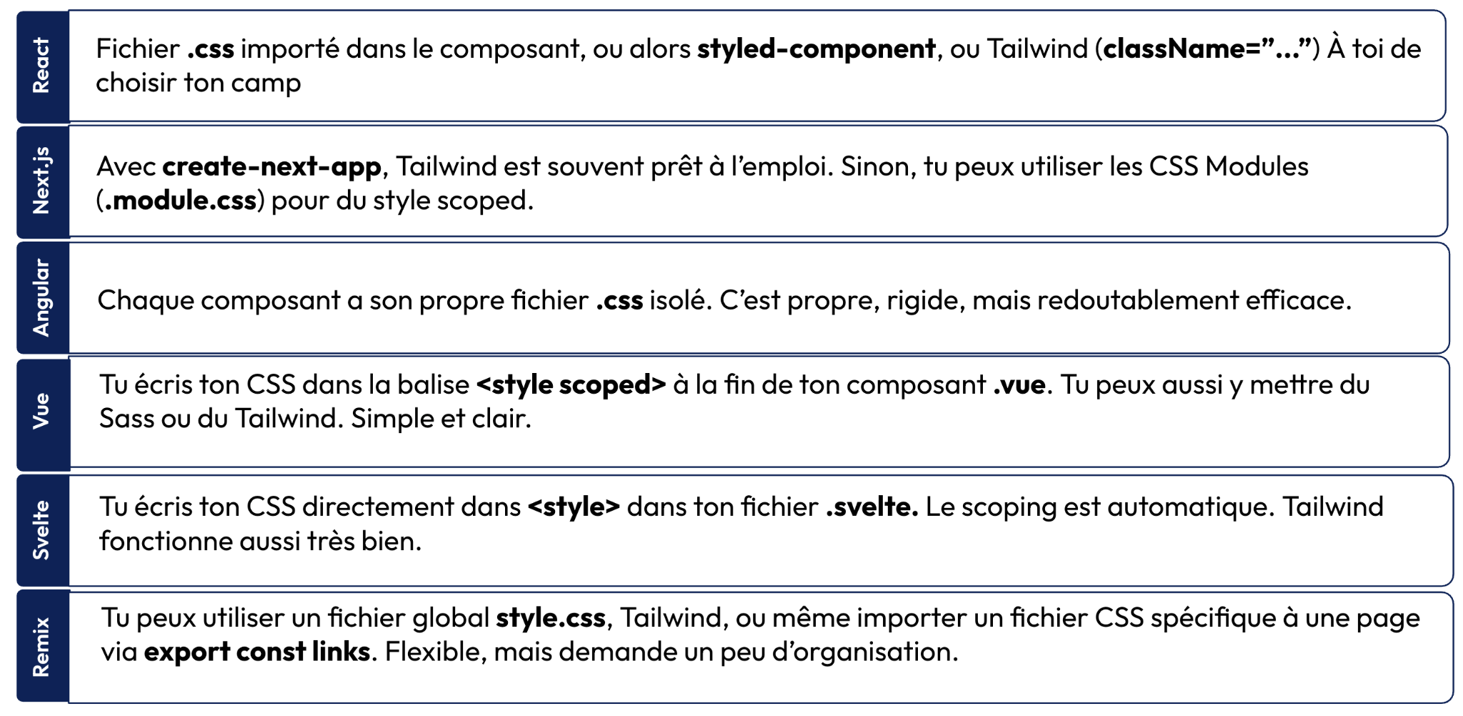 À retenir : tous les frameworks permettent d’appliquer du style facilement, mais certains favorisent l’isolation des styles, c’est-à-dire le fait que le CSS d’un composant n’impacte que ce composant et ne “fuite” pas vers le reste de l’application (Angular, Vue, Svelte), tandis que d’autres laissent plus de liberté au développeur (React, Remix). Tailwind s’intègre pratiquement partout aujourd’hui.