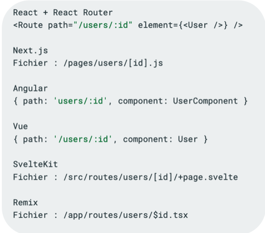 | Remix | Conventionnel (file-based) | Arborescence /app/routes/ | Oui (fichier $slug.tsx) | Oui | Loaders / actions + Error boundaries | Très orienté “nested routes / data loading server-side” |