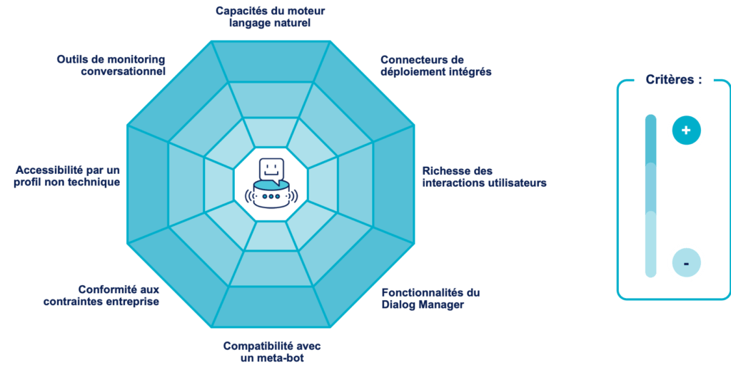 Voici les catégories de critères d’évaluation des plateformes chatbots qu’il convient de prendre en compte en amont du projet: