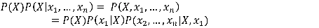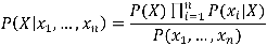 On itère ensuite de la sorte jusqu’à avoir développé les n caractéristiques. C'est ici qu’intervient l'hypothèse d’indépendance des caractéristiques (ou hypothèse naïve) : si les xi sont indépendants deux à deux, alors P(xi|X,xj) = P(xi|X). Ce qui fait que les facteurs conditionnés par X, d’une part, et des xi d’autre part, peuvent être récrits sous la forme de probabilités conditionnées par X seulement, de sorte que l’expression se réduit en fin de compte à la forme suivante :