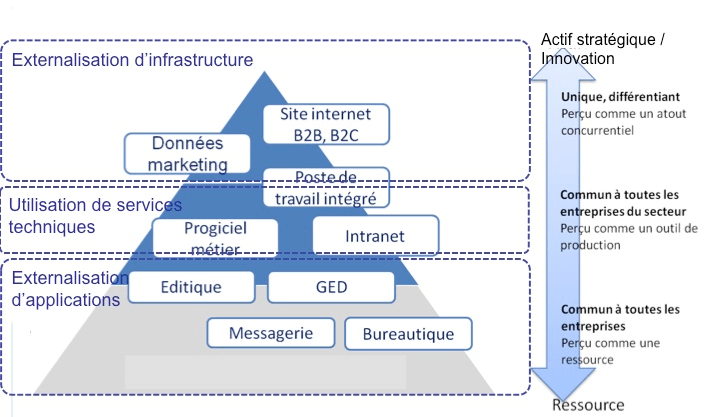 Nous verrons que la base de la pyramide se prete à l'externalisation d'applications, alors que le sommet est plus propice à l'externalisation d'infrastructure.