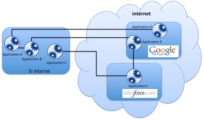 Dès lors, nous nous contenterons de définir le cloud hybride comme la nécessaire cohabitation entre un SI interne ("on-premise") d'une entreprise A et un service proposé par le cloud public.