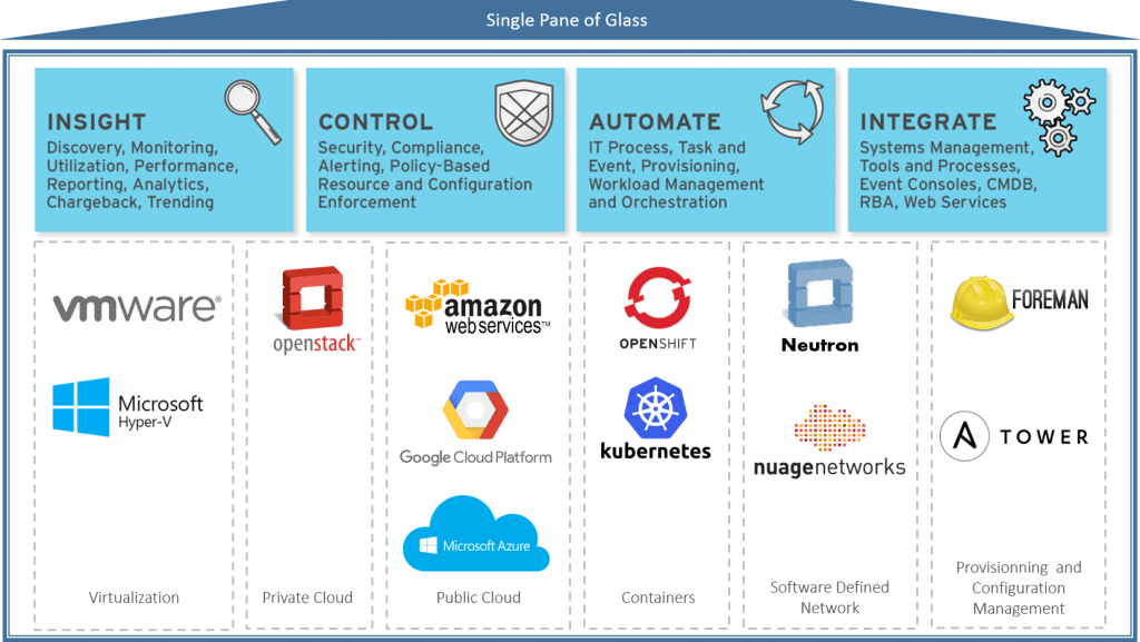 La promesse d’un “Hybrid Cloud Management Platform (hCMP)” est de fournir certaines fonctionnalités qui perdent de leur sens si elles ne couvrent pas l’ensemble de votre empreinte IT.