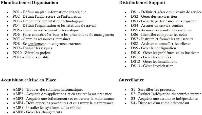 - le domaine Surveillance : 4 objectifs permettent au management d'évaluer la qualité et la conformité des processus informatiques aux exigences de contrôle.