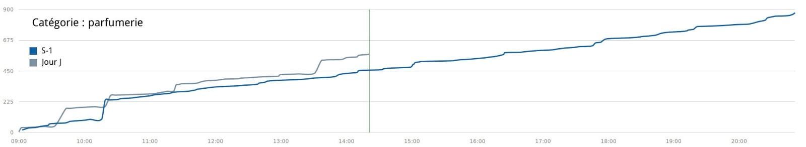 Par exemple, il souhaite pouvoir obtenir en temps réel la performance du chiffre d'affaire de chacune des catégories de produits comparée au même jour de la semaine précédente (cf. graphe ci-dessous) de sorte à pouvoir déclencher des actions marketing avec une bonne réactivité.