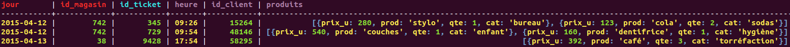En relationnel, on utiliserait plusieurs tables : l’une pour l'entête des tickets contenant les méta-informations, une autre pour chaque ligne du ticket contenant le produit, une autre qui serait le référentiel des produits etc... Dans le monde du NoSQL, il est usuel de dénormaliser les données : on privilégie la performance en temps de lecture et d'écriture plutôt que la réduction du coût du stockage. De façon simpliste, on pourrait modéliser les tickets ainsi :